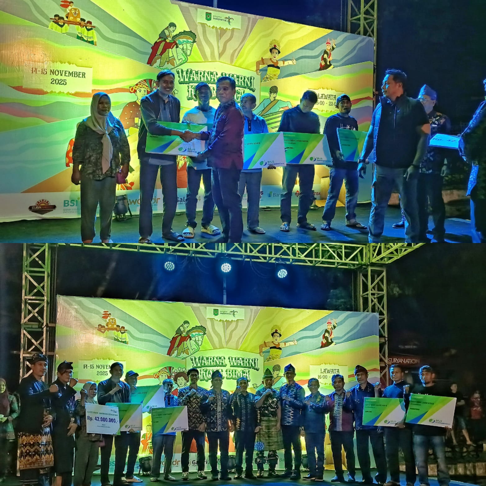 Kepala Dinas Tenaga Kerja Kota Bima Taufikrahman, S.Pd.,M.A.P menyerahkan secara simbolis Kartu Kepesertaan BPJS Ketenagakerjaan kepada petani tembakau penerima bantuan iuran BPJS Ketenagakerjaan yang menggunakan anggaran Dana Bagi Hasil Cukai Hasil Tembakau (DBH-CHT) pada acara Warna-Warni Kota Bima 2025 yang digelar di Destinasi Pantai Lawata Jum’at, 14 November malam.